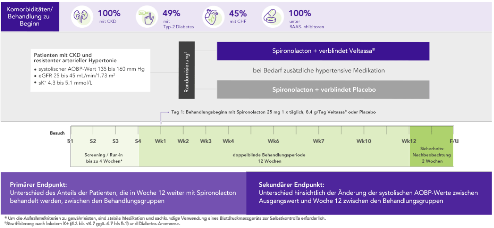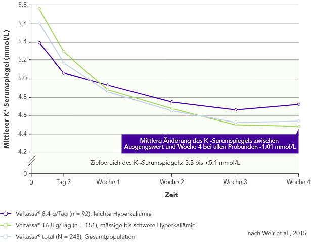 Bei 306 Patienten mit Typ-2 Diabetes, CKD und arterieller Hypertonie, die mit RAAS-Inhibitoren behandelt wurden, war der K+-Serumspiegel nach vier Wochen mit Veltassa® signifikant niedriger. Dieser Zustand wurde ein Jahr lang aufrecht erhalten bei: